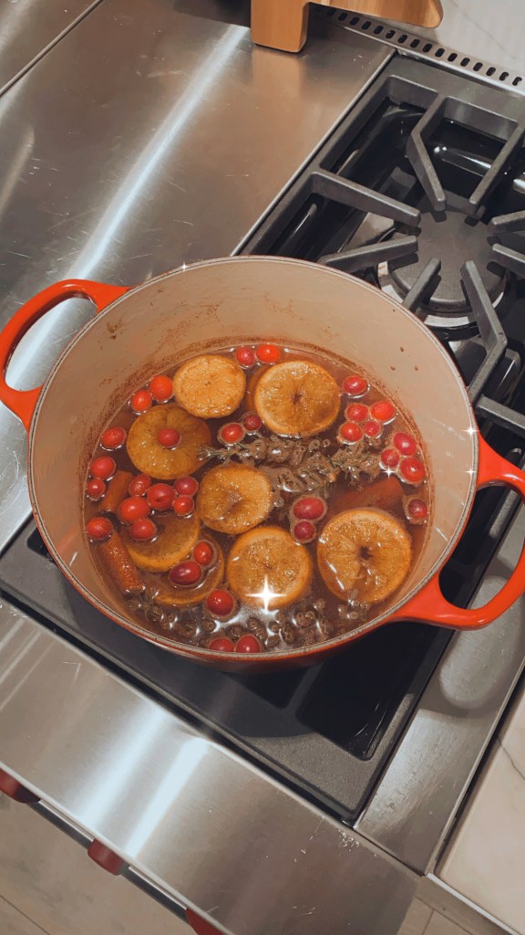 Slice the clementine oranges and combine with all other ingredients in a small pot with 2 cups of water. simmer all day and add water as needed.